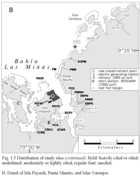 The study continued in part for an additional year under another grant, but that data is not included, nor is data collected before the spill or data collected by the STRI ESP program (such as the urchin data from Galeta). Most of the data on the chemistry of the oil are presented in tables in the final report and are not available in digital format.